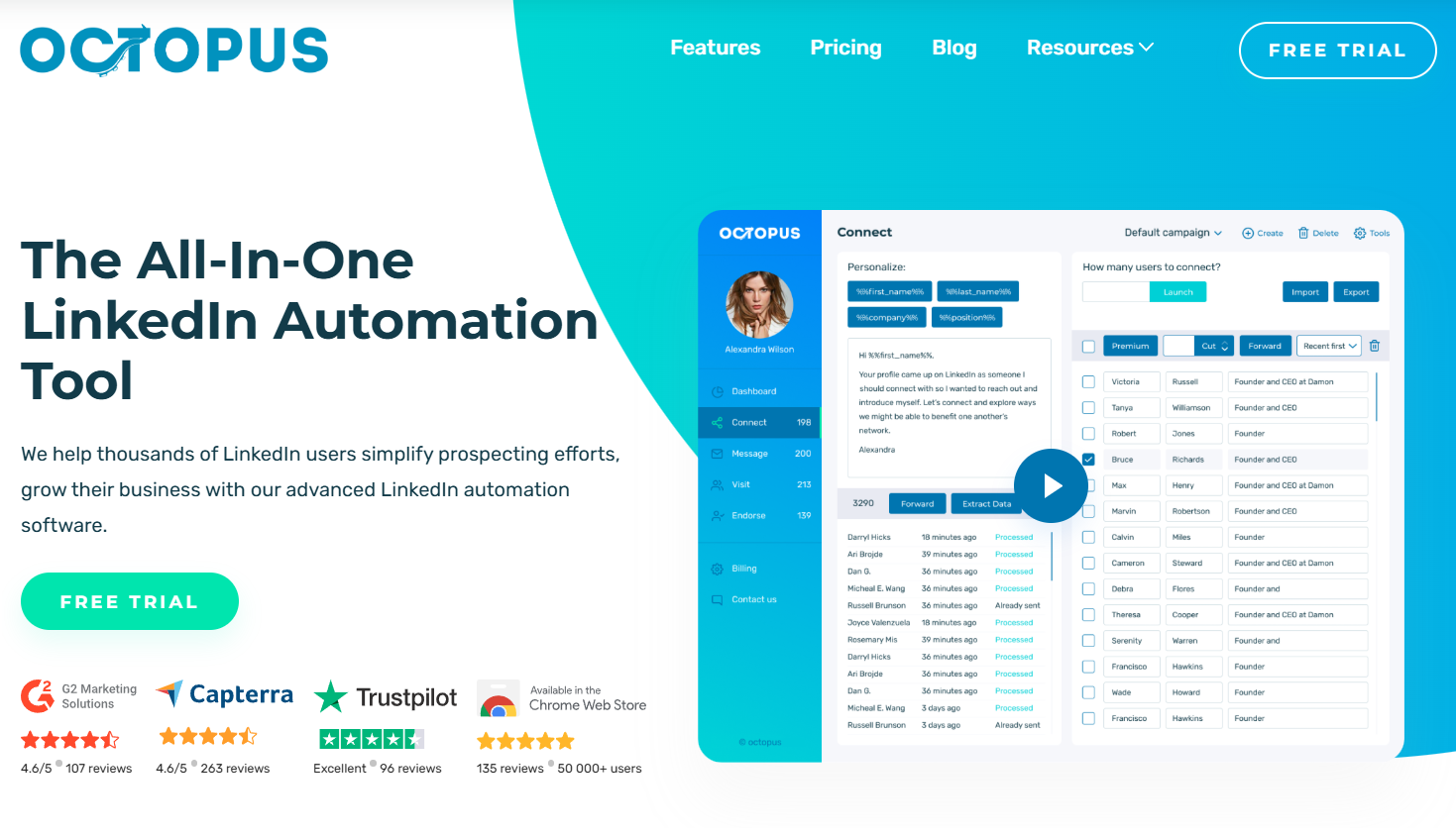 Octopus CRM is one of the most user-friendly LinkedIn automation tools for professionals who need to manage outreach efficiently without complex setups. It operates as a Chrome-based extension, allowing users to automate essential LinkedIn actions like sending connection requests, messaging new contacts, endorsing skills, and visiting profiles-all directly from their browser.